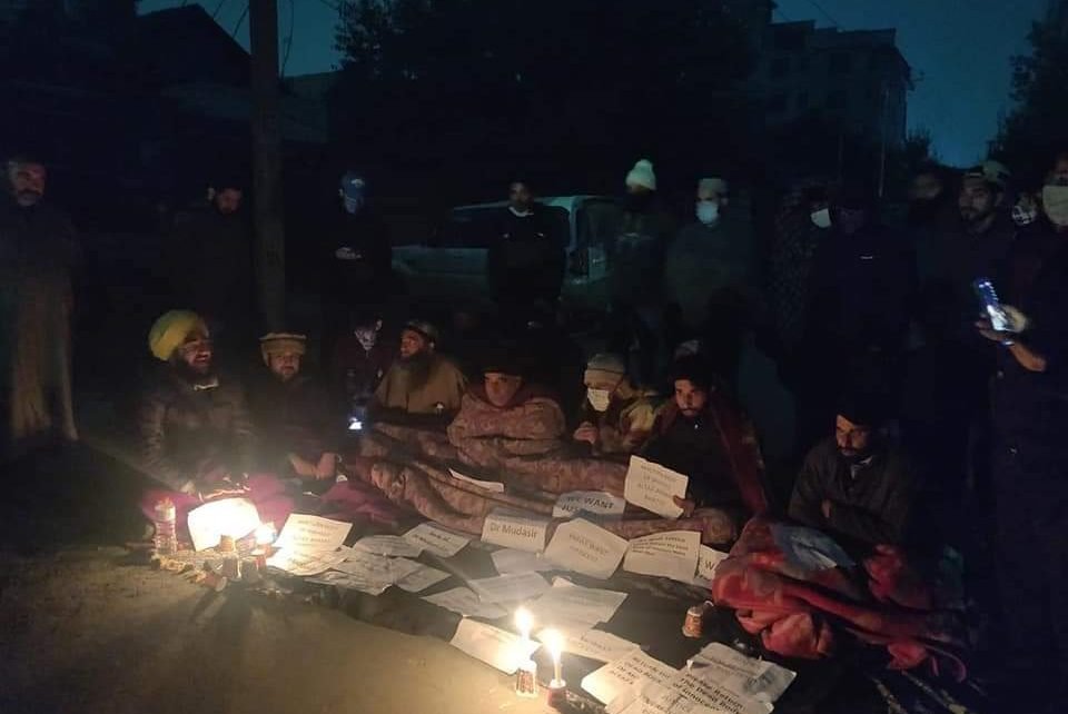 The protesters kept on shouting slogans “we want justices, and “Lashun par haq kis ka hai, warisun ka hai (who have right on the bodies of dead, only family members)” at the press colony in Srinagar to press for their for returning bodies of businessmen, Altaf Ahmad Bhat and Dr Mudasir Gul, who were killed on Monday evening at Hyderpora.