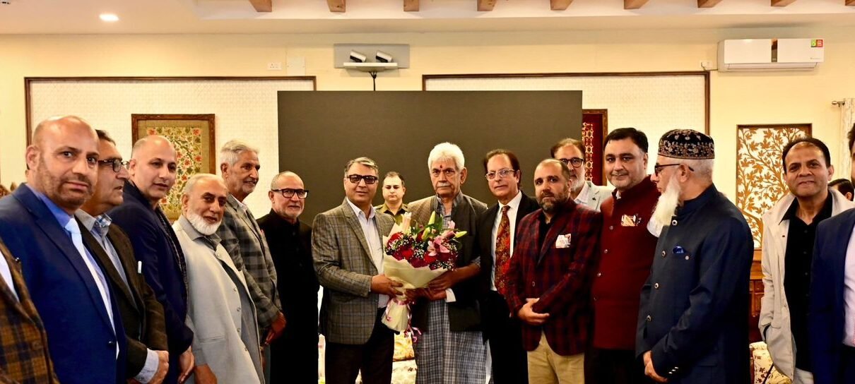 SRINAGAR (KIMS) — A delegation of the Executive Committee of the Kashmir Chamber of Commerce and Industry (KCCI), led by its President Javid Ahmad Tenga, met Lieutenant Governor Manoj Sinha at Raj Bhawan for an introductory interaction with the newly elected office bearers and executive committee members.