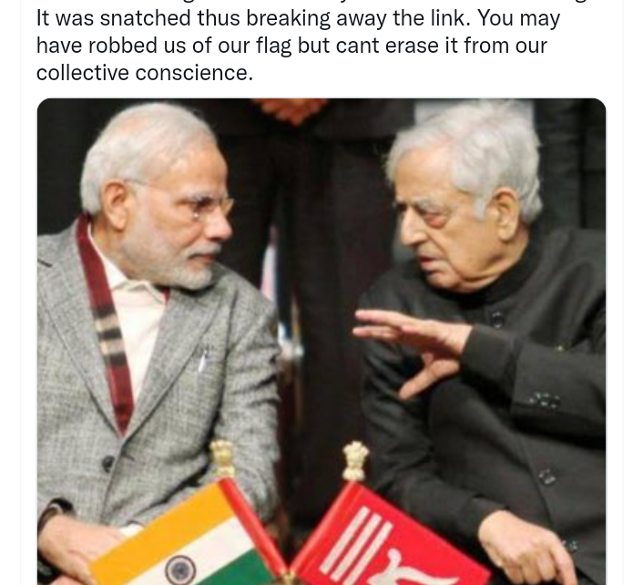 “Changed my dp since a flag is a matter of joy & pride. For us our state flag was irreversibly linked to the Indian flag. It was snatched thus breaking away the link. You may have robbed us of our flag but cant erase it from our collective conscience,” Mehbooba tweeted.
